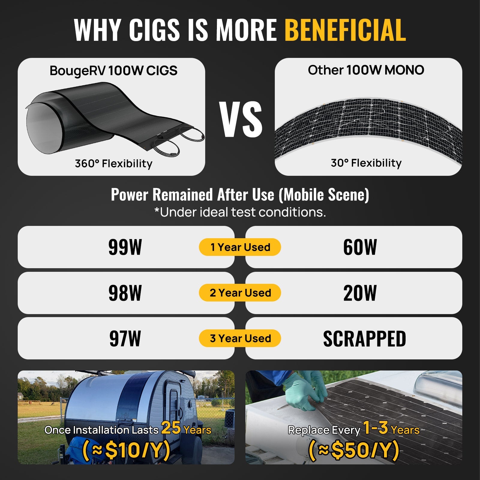 Compared to traditional rigid solar panels, the BougeRV Yuma 100W CIGS Thin-film Flexible Solar Panel stands out for its superior flexibility and lightweight construction. Older crystalline silicone models often struggle with weight, fragility, and limited surface compatibility, but the Yuma 100W panel easily adheres to RV roofs, boats, camper vans, or curved metal structures. Unlike previous models, this panel leverages CIGS technology for extended durability and optimized solar absorption, even when sunlight angles change throughout the day.