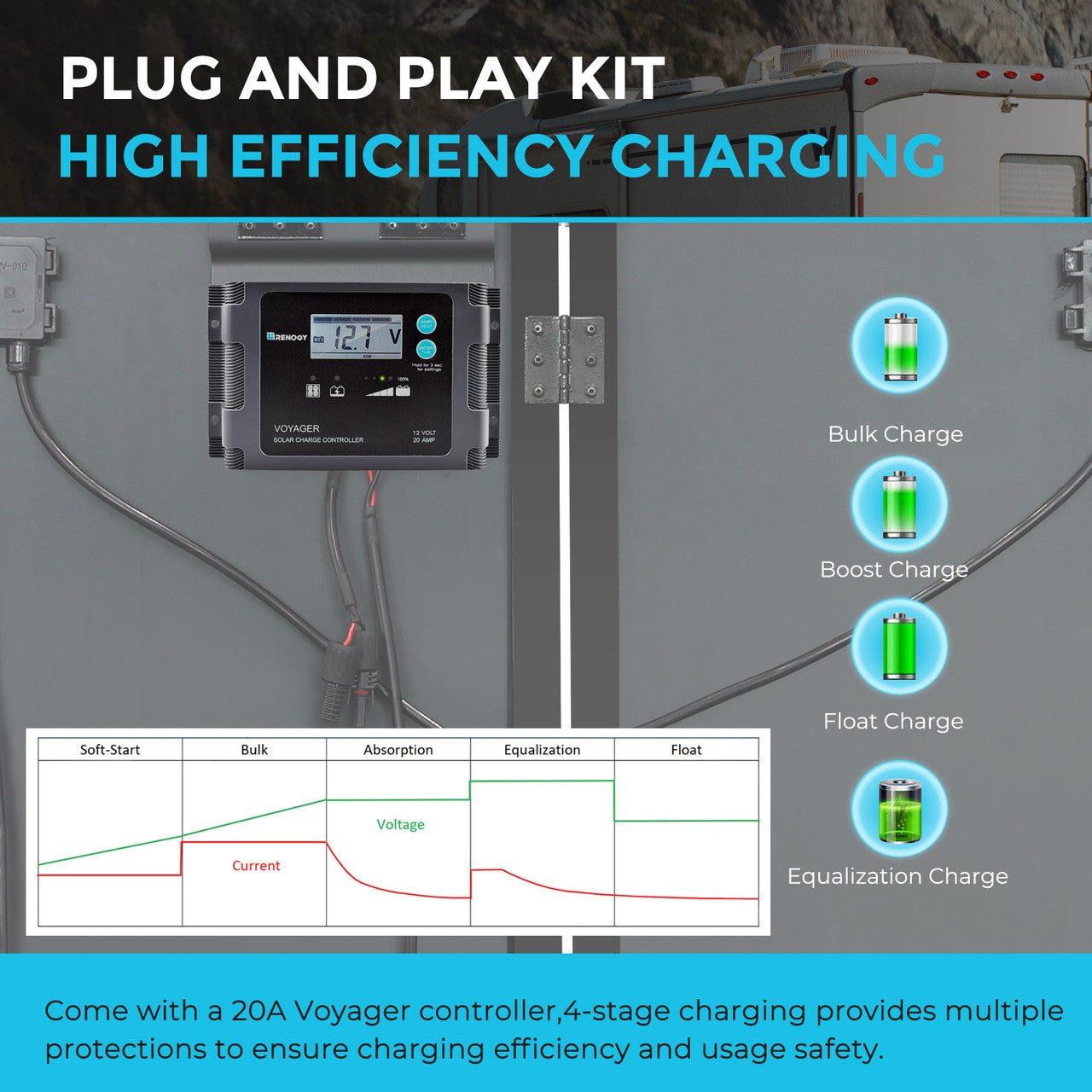 With utilizing smart PWM technology, the Voyager controller provides efficient, stable, and safe charging.Multiple protection keeping your battery and system fully protected.
