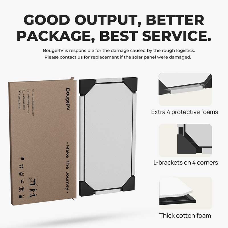 BougeRV 200 watt bifacial solar panel is a high-performance and efficient solution for harnessing solar energy. Its unique transparent backside allows for a 30% increase in output compared to standard models, making it a powerful and reliable choice for any solar power system. Upgrade your energy system with our top-of-the-line 200 watt bifacial solar panel.