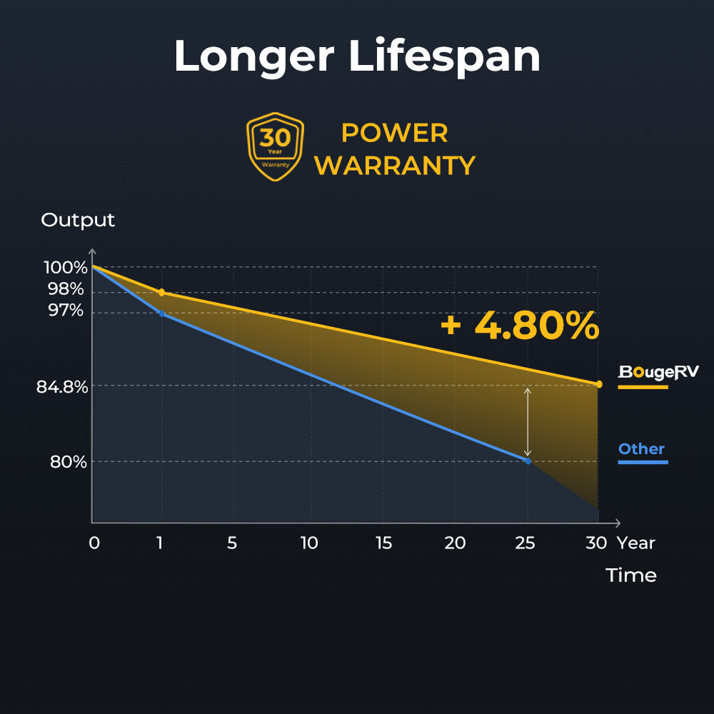 Unlock the future of solar with the BougeRV N-Type TopCon 300 Watt Solar Panel. Featuring next-gen N-TYPE & TopCon technology, this high-efficiency 300W solar panel delivers up to 25% conversion efficiency and 80% maximum bifacial gain, capturing sunlight from both sides to supercharge your energy output. Lightweight and engineered for a 30-year lifespan, it’s ideal for home rooftops, ground mounts, off-grid systems, cabins, and RVs!