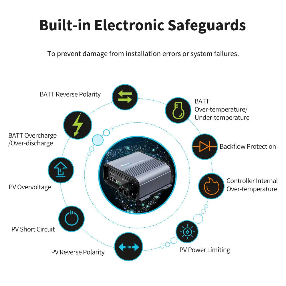 The advanced MPPT technology delivers a minimum of 99% tracking efficiency and 90% charge conversion efficiency, ensuring optimal battery charging. With a 4-stage charging process (Bulk, Boost, Float, and Equalization), it provides efficient and precise charging for various battery types.
