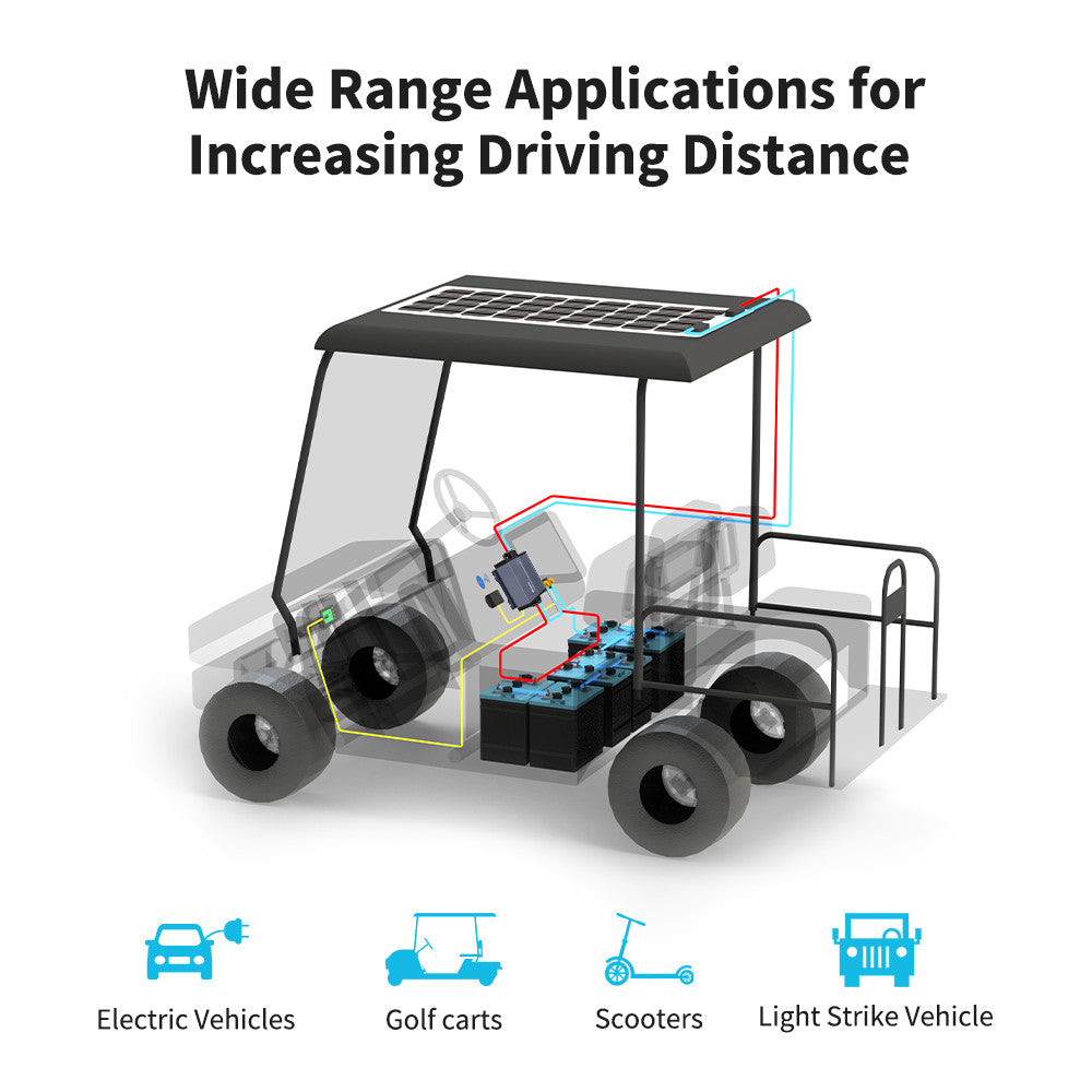 To charge the 36V/48V battery bank with either PWM or MPPT charge controller, the solar panel voltage should be more than 36V/48V. But in some cases, you may only have just one single 12V or 24V solar panel to charge a 36V or 48V battery bank, especially when you would like to charge batteries in places with limited space for solar, such as a golf cart. The Renogy 10A Rover Boost charge controller is a unique solution to boost the lower solar voltage to charge a high voltage battery bank.