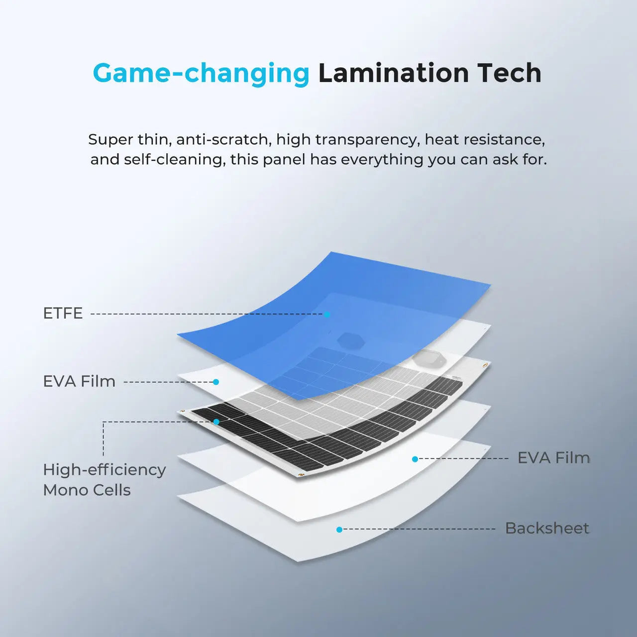 • Hardly noticeable, the Renogy 50W Lightweight Panel laid flat is only a tenth of an inch tall making it ideal for a stealthy solar setup.