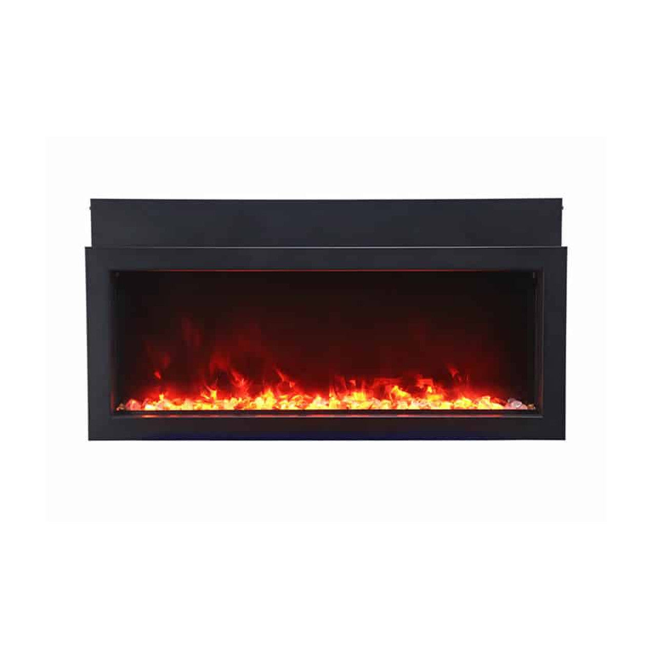 The Amantii Panorama 50 Extra Slim Indoor/Outdoor linear Electric Fireplace is an excellent addition to any home. This cutting-edge fireplace boasts vivid, multi-colored flames that can be switched from yellow to orange to red with a single touch of the remote. The amantii electric fireplace has two-stage heater allows you to tailor your heating needs, and the hard-wired thermostat ensures simplicity and ease of operation. With its compact 4" depth, this fireplace can fit practically anyplace, making it ideal for small rooms or alcoves.The linear electric fireplaces due to its full-frame viewing and optional black steel surround. This built in electric fireplace has  whole frame viewing option allows you to select finishing materials that extend right up to the glass for an extremely realistic appearance. The black steel surround is also included in the box, allowing you the option of adding a more classic look if desired.