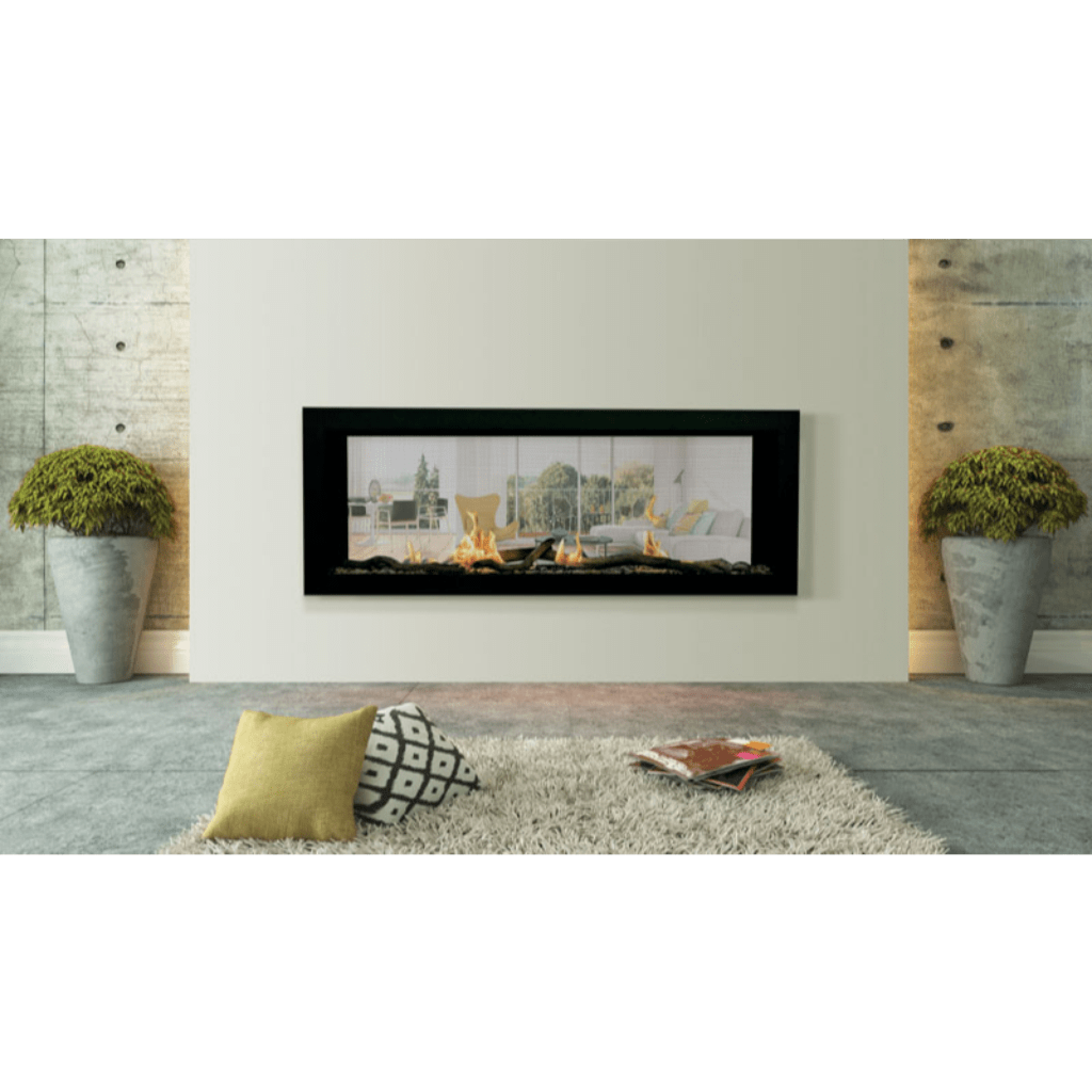 The Emerson 48ST  is a slim 48″ wide See-Thru gas fireplace that is just 9″ deep. Featuring a robust flame and a significant heat output at 26,000 BTU’s, the Emerson is a lovely addition to any space. It comes standard in the Deluxe version, and with black fire glass media and deluxe remote control.