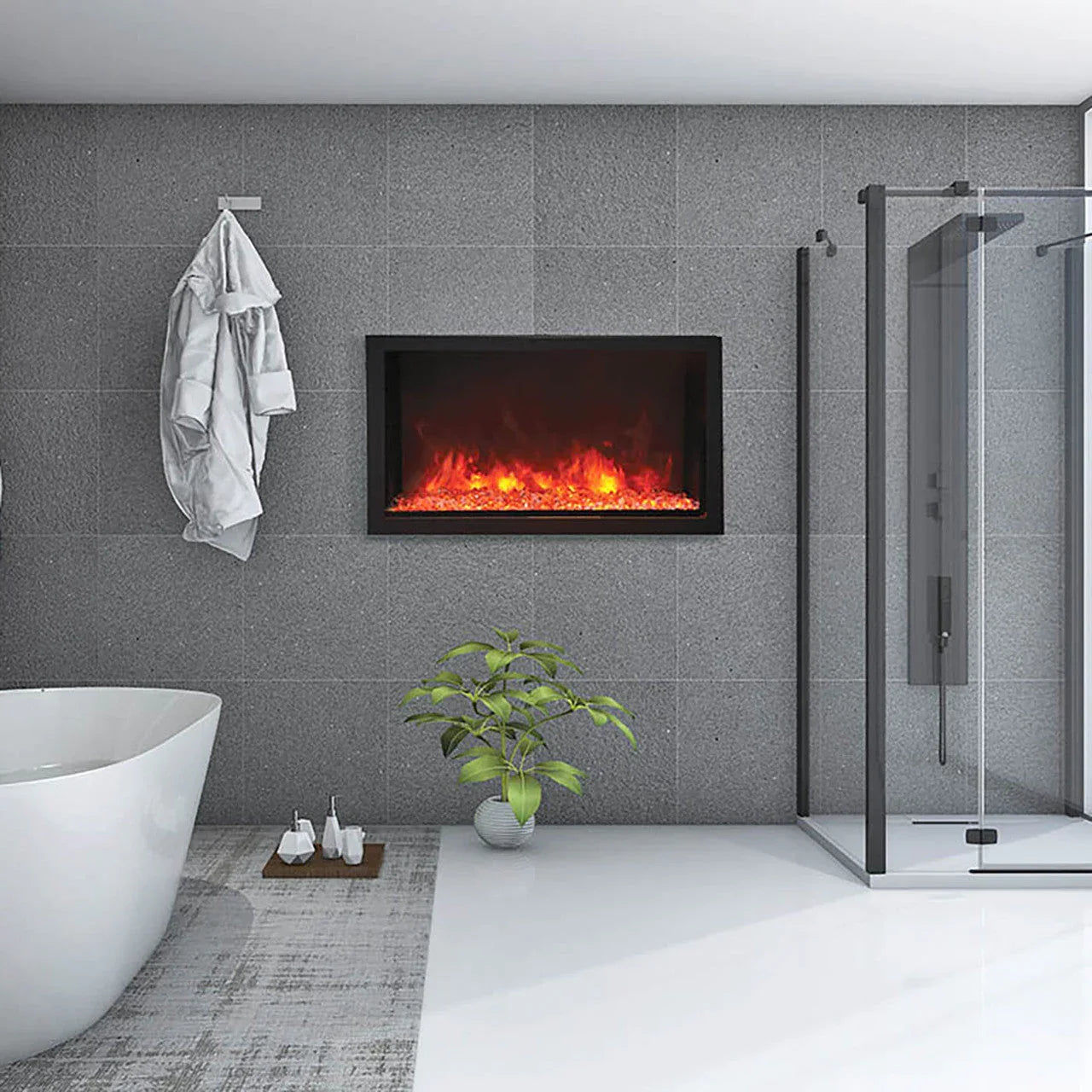 The Amantii Panorama 50 Extra tall Outdoor Electric Fireplace is an excellent addition to any home. This cutting-edge fireplace boasts vivid, multi-colored flames that can be switched from yellow to orange to red with a single touch of the remote. The two-stage heater allows you to tailor your heating needs, and the hard-wired thermostat ensures simplicity and ease of operation. With its compact 4" depth, this panoramic electric fireplace can fit practically anyplace, making it ideal for small rooms or alcoves. The Amantii Panorama 50 inch electric fireplaces due to its full-frame viewing and optional black steel surround. The whole frame viewing option allows you to select finishing materials that extend right up to the glass for an extremely realistic appearance. The black steel surround is also included in the box, allowing you the option of adding a more classic look if desired.