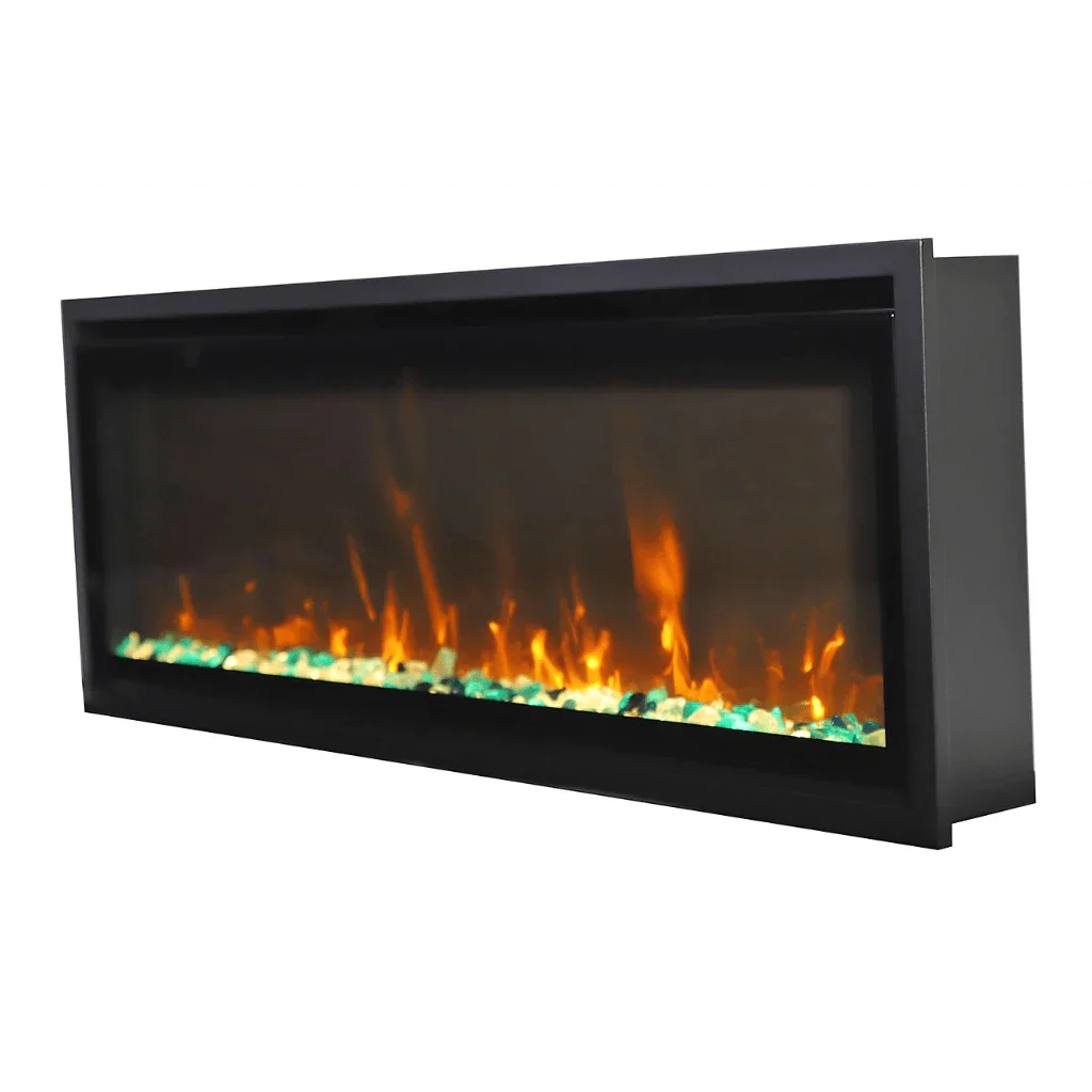 The 55-inch electric fireplace comes with clear glass diamond media and a stylish black steel surround. It adds elegance to its modern design. It fits well in any space without dominating the room. The electric wall mount fireplace runs on 120AC / 60 Hz volts. Its max wattage is 1465 watts. The heater uses 25 watts, and the motor heater needs 19 watts. It weighs 86 lbs and has a plug on the left side for easy installation. Create a warm vibe at home with the Amantii Remii 55-inch Wall Mount Electric Fireplace. It blends style, function, and cool features, making it a room centrepiece.