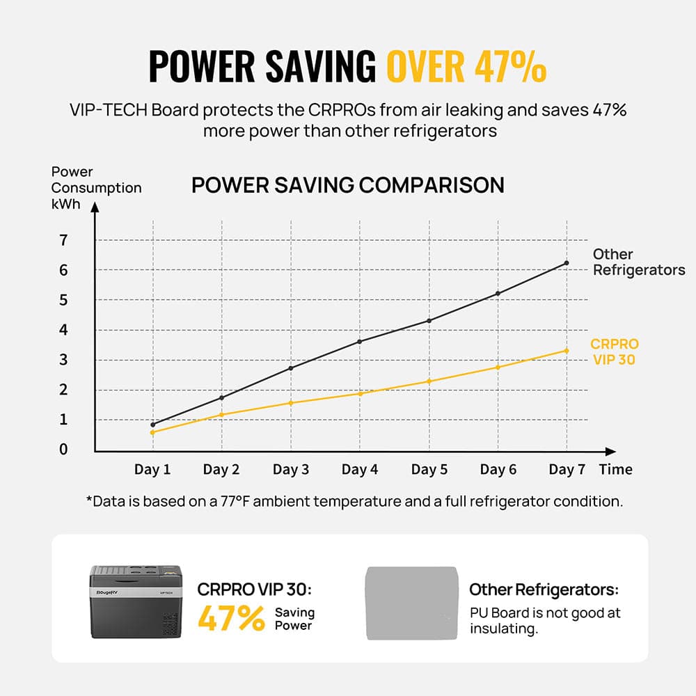 Compared to industry-standard portable car fridges, the CRPRO30 VIP Upgraded 30 Quart 12V Car Fridge Kit delivers professional-grade temperature precision, maintaining contents at consistent, optimal temperatures, whether you're freezing meat or chilling drinks. Its 30-quart capacity easily accommodates multi-person use, outperforming the storage space of many previous models. While similar fridges may consume more energy and generate higher noise, this model stands out with its efficient 45W power draw and quiet operation below 45 dB, making it ideal for use in vehicles, RVs, or even compact living spaces.