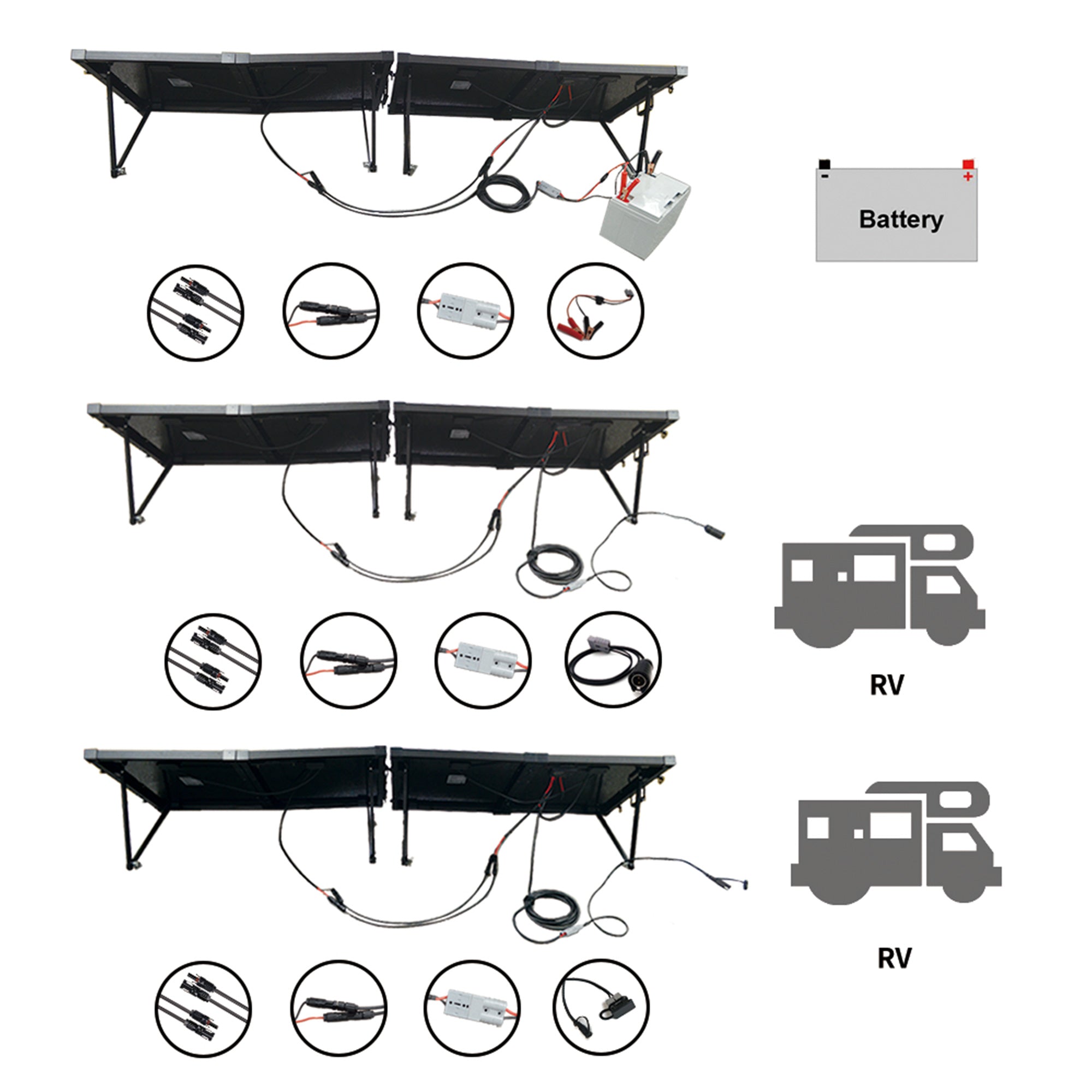 • Pre-installed stand allows for easy and quick set-up. MC-4 connectors or Anderson plug allow easy installation to RV or battery unit