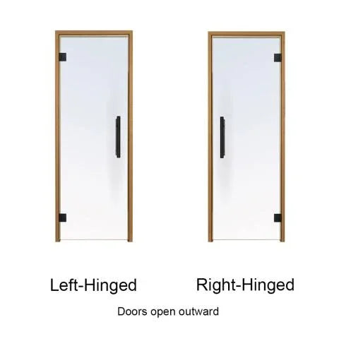 Stylish vertical door-pulls match your choice of wood feature Stainless Steel outer handles, while the inner handle is crafted of wood to ensure that it remains comfortable to the touch in a hot sauna. All doors include robust Aluminum hinges that compliment the color of the wood frame.