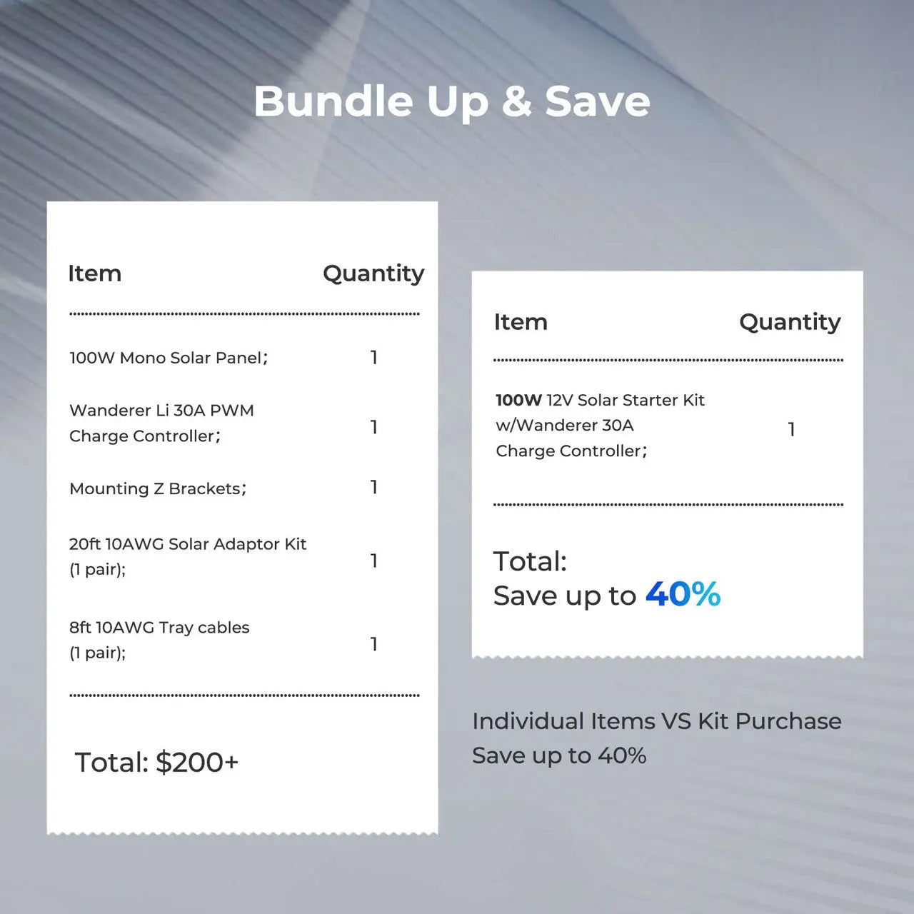 This Renogy Solar Kit includes all of the equipment necessary for building a new system. The included cables, Z-brackets, and pre-drilled holes on the back frame of the panel allow fast and secure mounting. With the Wanderer Li 30A PWM Charge Controller, the kit can meet your further power needs by adding more of the same solar panels to expand up to 400W.