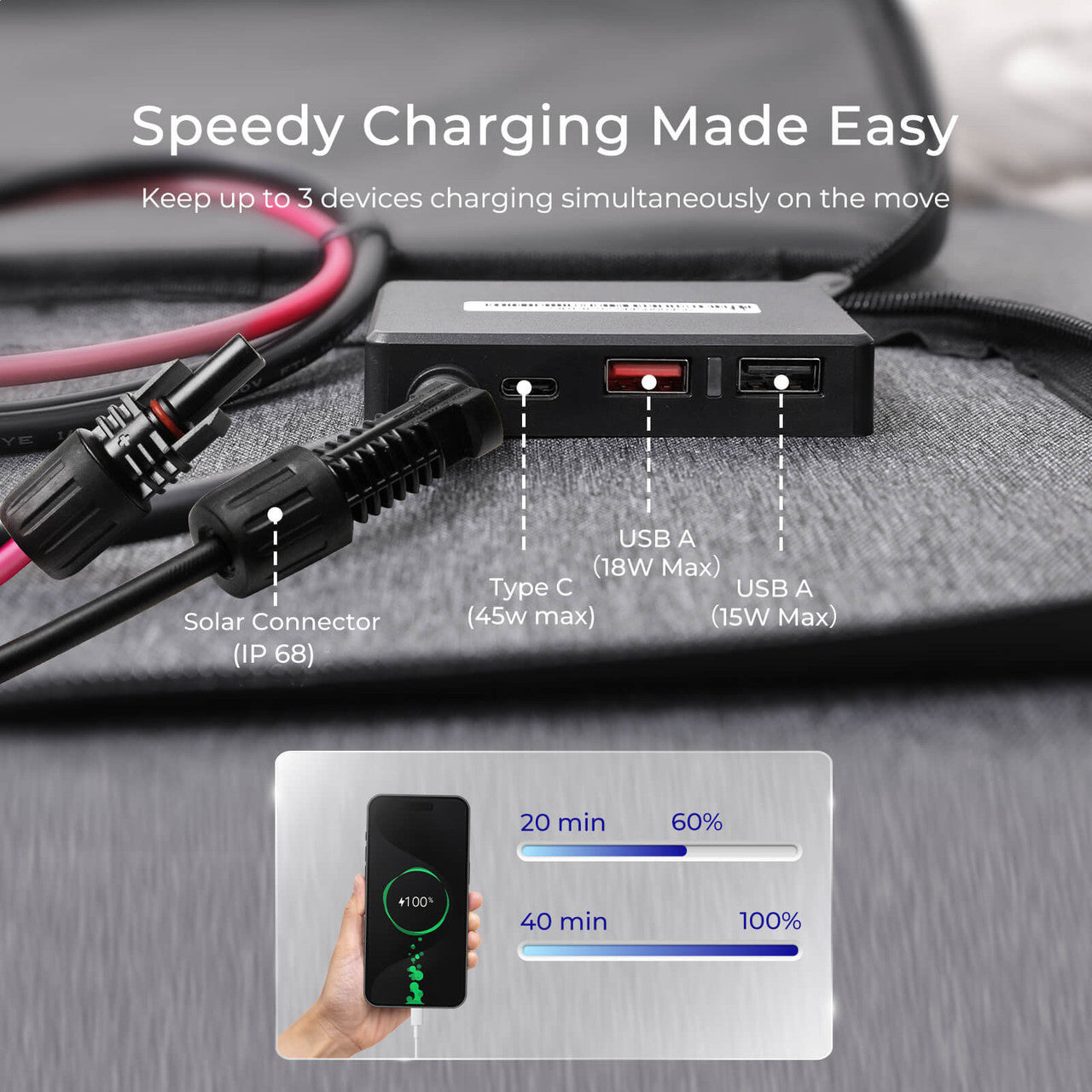 The Renogy E.Flex Series is ready to generate electrical power wherever sun rays land, offering a versatile charging solution for portable power stations or off-grid DC batteries. The 100W E.Flex solar panel provides up to 500Wh per day under average sun conditions, making it perfect for short trips, camping, or fishing.