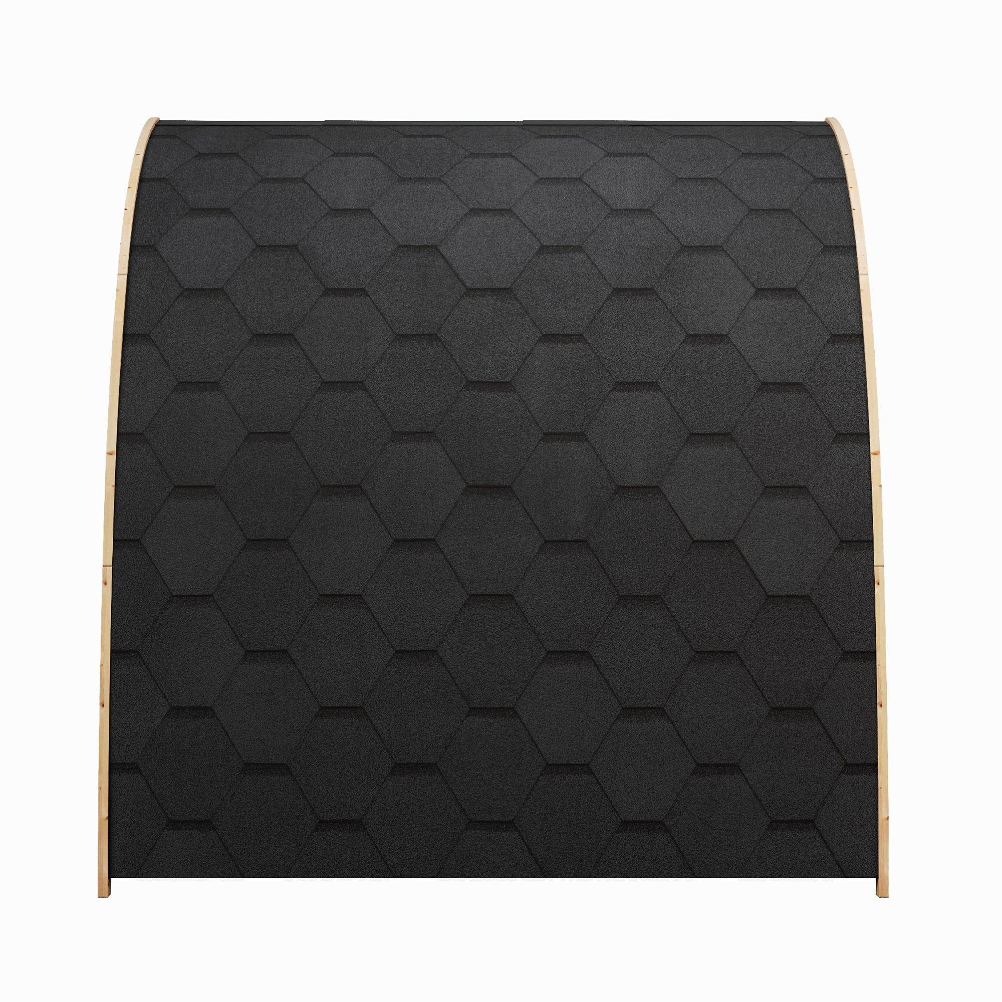 This unique shape results in excellent space efficiency, natural heat circulation, and superior weather protection. A full height shingled roof and recessed front porch protect from the elements in any weather conditions. The durable, weather-resistant thermo-pine exterior ensures that your backyard sauna will provide years of wellness and relaxation.